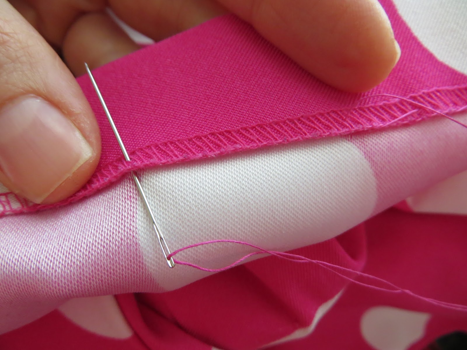 Here is how to do a killer blind hem stitch: With your needle, just barely pick up two threads from the front and stick the rest of the needle through the folded up hem like how you see me doing in the picture below. Skip between a centimeter and an inch and make your next stitch. Keep doing that all around the hem. . .However. . .